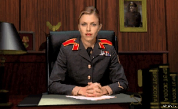 Genossin Nadja und ihr glatzköpfiger Untergebener wollen die Macht in Russland, Nadja gibt den Generälen ihre Marschbefehle