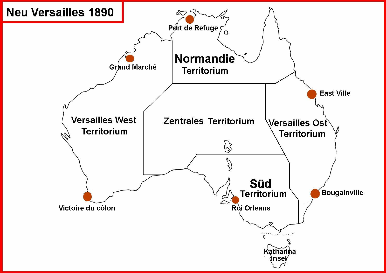 Der Kontinent Neu Versailles ist seit dem späten 18. Jahrhundert französische Kolonie. Entdeckt wurde Neu Versailles 1769 durch den französischen Weltumsegler Louis Antoine de Bougainville. Um Bougainville zu Ehren wurde 1791 die Hauptstadt im Versailles Ost Territorium nach Ihm benannt. Seinen Namen „Neues Versailles“ hat der trockene Kontinent durch den französischen Kartographen Zocktan de la Sale erhalten. Als er und Bougainville 1771 in das Innere des Wüstenkontinents vordrangen witzelte er dass sie hier wohl ein neues Versailles entdeckt haben. Im späten 18. Und frühen 19. Jahrhundert gab es nur wenig Zuwanderung daher war das „fruchtbare“ neue Versailles nur spärlich besiedelt. Die französische Marine nutzt einige Forts an der Küste für die auf Munitionierung und Versorgung. In den Jahren des Weltenbrandes (1823-1827) siedelten sich Hugenotten aus der Normandie im Norden an und Gründeten 1826 die Stadt Port de Refuge. (Übersetzt Hafen der Zuflucht) Bis 1850 entstanden mehrere Siedlungen die nach und nach an regionaler Bedeutung gewannen.
