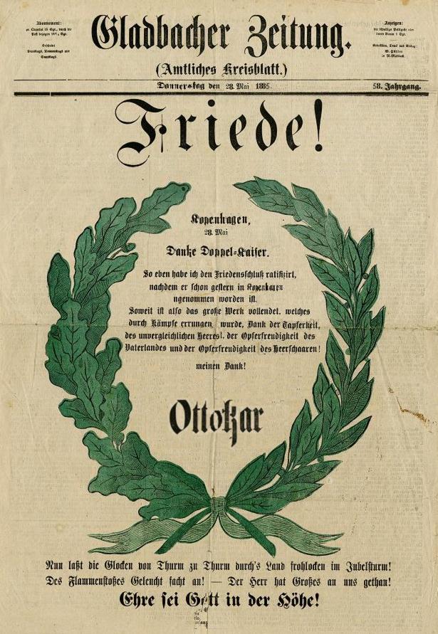 „So eben habe ich den Friedenschluß ratifiziert, nachdem er schon gestern in Kopenhagen angenommen worden ist. Soweit ist also das große Werk vollendet, welches durch Kämpfe errungen wurde, Dank der Tapferkeit, des unvergleichlichen Heeres, der Opferfreudigkeit des Vaterlandes und der Opferfreudigkeit der Heerscharen!