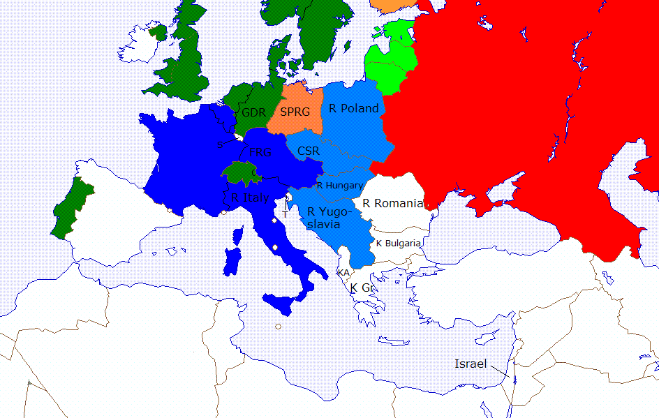 Die Verbündeten von Nazi-Deutschland in Europa hatten bereits 1946 Friedensverträge abgeschlossen, mit ähnlichen Ergebnissen wie in UZL. Jugoslawien und die Tschechoslowakei wurden wiederhergestellt. In Deutschland klare Verhältnisse herzustellen, dauerte etwas. Stalin verlangte territoriale Erweiterung (heißt: mehr als die Gebiete, die er von Finnland und Rumänien genommen hatte) und Teilnahme an der deutschen Besatzung. Und die Franzosen und Polen verlangten die Zerstückelung von Deutschland. Schließlich wurde ein Kompromiss gefunden: Polen gab Litauen Wilna zurück, und das meiste Gebiet östlich der Curzon-Linie an die SU (außer Lemberg), aber erhielt ganz Ostpreußen und die Osthälfte von Pommern und Schlesien. Als sich die britische Regierung für Stalin einsetzt, stimmt auch Truman zu, aber unter der Bedingung, dass die USA die sowjetisch besetzte Zone überwachen darf. Die neue deutsche Regierung protestiert gegen Stalins Besatzung, aber muss Sowjet-Truppen nach Deutschland lassen. (Die Besatzung erweist sich als weniger hart als die aus UZL: Die Deutschen waren von den Amerikanern vorgewarnt, und viele reiche Leute - und Ex-Nazis - können in den Westen fliehen.) Stalin ist immer noch ärgerlich, weil sein Land bei weitem die meisten Toten zu beklagen hat und dafür fast nichts bekommt. (Er hat allerdings Finnland. Und die Gelegenheit, in "seinem" Teil von Deutschland Fabriken, Eisenbahnen, und alles von Wert plündern zu lassen.)