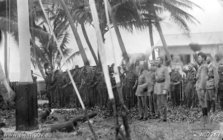 Die Briten hissen ihre Flagge nach der Kapitulation der Deutschen auf Nauru, 7. November 1914.