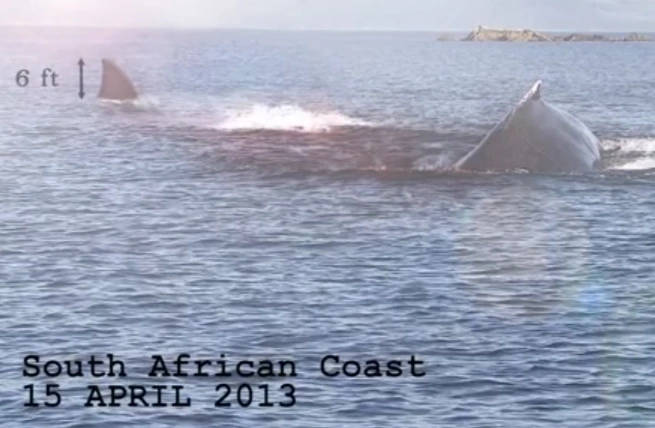 Bei den Ermittlungen des Wissenschaftlers sprach er auch mit einer Beobachterin, die in Südafrika am Strand für Haiwarnungen zuständig ist. Diese hatte einige Tage zuvor den Angriff eines unbekannten Haies auf einen Wal fotografieren können. Das Foto zeigt einen Hai mit einer erschreckend großen Mittelflosse, die ca. 6 Fuß (ca. 1,80 Meter) aus dem Wasser ragt.