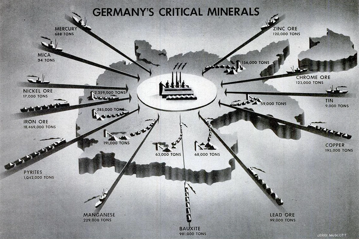 Eisenerz: Baumaterial für Waffen und Fahrzeuge aller Art, Eisenbahnschienen, Stahlbeton für Befestigungen. 1940 wurden weltweit etwa 200 Millionen Tonnen gefördert. Lothringen (Frankreich), Schweden, Kriwoi Rog (Ukraine), Australien, Philippinen