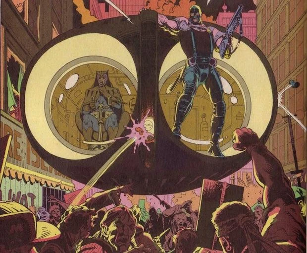 1977: Durch den Keene-Erlass ist Vigilantentum verboten. Nixon verlangt auch von den Watchmen Konformität; nur noch Superhelden, die für die US-Regierung arbeiten, sind erlaubt.
