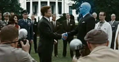 Doktor Manhattan schüttelt US-Präsident John F. Kennedy die Hand (aus dem Film)