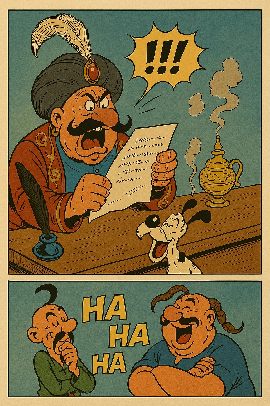 Mehmet IV leyendo la carta en broma de Astapryk y Odoryk.