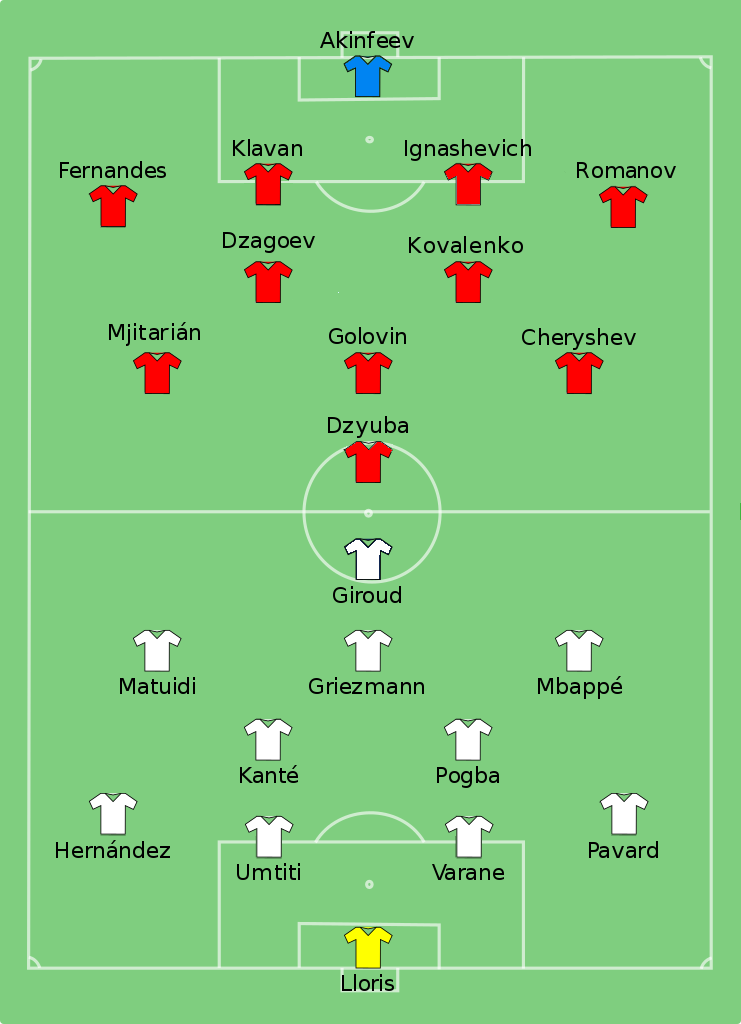 Después de la Ceremonia de Clausura comenzó el partido, los 10 primeros minutos fueron dominados por Rusia que intentaba encontrar espacios en la defensa francesa, mientras que Francia jugaba a las Contras. En una de esas contras Griezmann recibió una falta de Fernandes, el mismo Griezmann cobro el tiro libre que mando el balón al fondo de la red con Akinféev sin poder hacer nada dando la ventaja a Francia. Sin embargo la ventaja le duro poco, cuatro minutos después, en un corner y en medio de rebotes le balón le cayo a Dzagóyev el cual le dio pase a Chéryshev que del fuera del área se marco un golazo consiguiéndole el empate a Rusia, el resto del primer tiempo fue trabado, con ambos equipos intentando conseguir la Ventaja, al Minuto 28 Ruslán Romanov estuvo cerca de dar la ventaja a Rusia pero su disparo termino estrellándose con el poste. Al Minuto 33 en otro corner Viktor Kovalenko termina tocando el balón con mano, y después de la Revisión en el VAR se pita penal a favor de Francia. Antoine Griezmann fue el encargado de tirarlo el cual lo tiro a la izquierda con la mala fortuna de que Akinféev terminaría tapándolo. Por el minuto 54 en un saque de banda, Hernández manda un pase filtrado a Griezmann que entra en área y engaña al guardameta ruso y marca la ventaja para los galos, Tiempo después al minuto 57 en una contra gracias a la recuperación del balón de parte de Umtiti, Mbappé le manda un centro a Giroud que marca de placer poniendo el 3-1 el cual parecía certero.