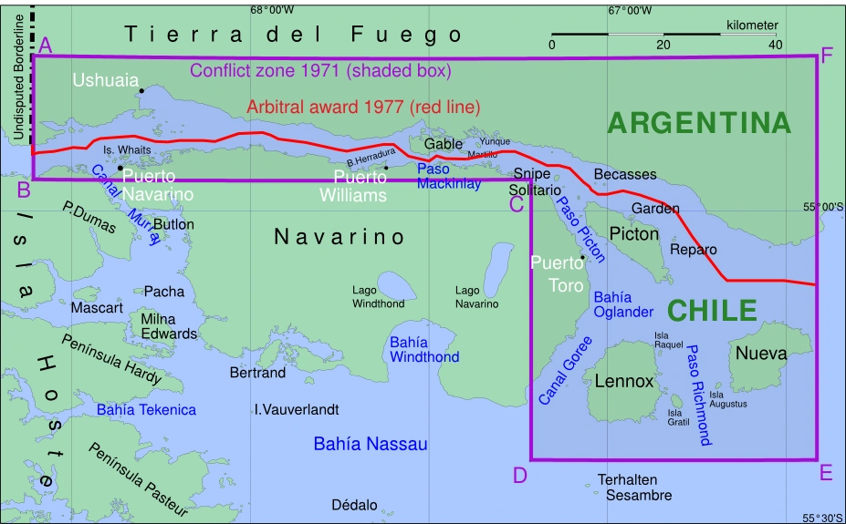 - El límite marítimo era la línea de puntos equidistantes a las costas chilenas y argentinas más cercanas. (Aproximadamente una línea desde la salida oriental del canal Beagle en dirección sureste).
