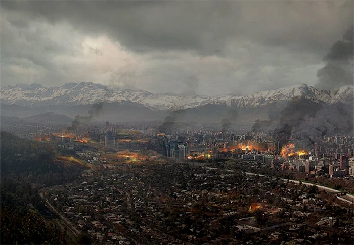 Vista aérea de Santiago de Chile luego de los violentos bombardeos realizado por la Fuerza Aérea Argentina.