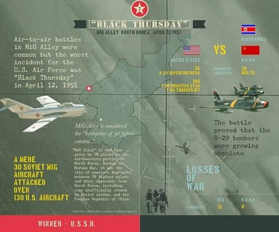 Cabe destacar el combate librado el 12 de abril de 1951, llamado "Martes negro" por los norteamericanos 45 Mig15 interceptaron una enorme formación de 48 Superfortresses, 18 Sabres, 54 Thunderjets y 24 Shooting Stars que se dirigían a bombardear el vital puente sobre el río Yalu en Uiju. Cuando la batalla terminó, los experimentados aviadores soviéticos habían abatido o dañado de forma irreparable diez B-29A, un F-86A y tres F-80C, todo esto contra la pérdida de un solo MiG.