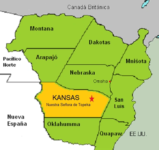 Kansas es una de las provincias que forman el Virreynato de los Territorios del Noreste o Alta Luisiana. Limita al norte con Idaho (Virreynato de los Territorios del Pacífico Noroeste), Arápajo y Nebraska, al este con San Luis, al sur con Oklahumma y al oeste con Colorado, Nuevo México (Virreynato de Nueva España). Su capital es Nuestra Señora de Topeka, fundada el 13 de agosto de 1826.