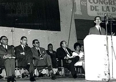 Fuentealba dando un discurso. Atras sentados aparecen Radomiro Tomic, Eduardo Frei Montalva, entre otros.