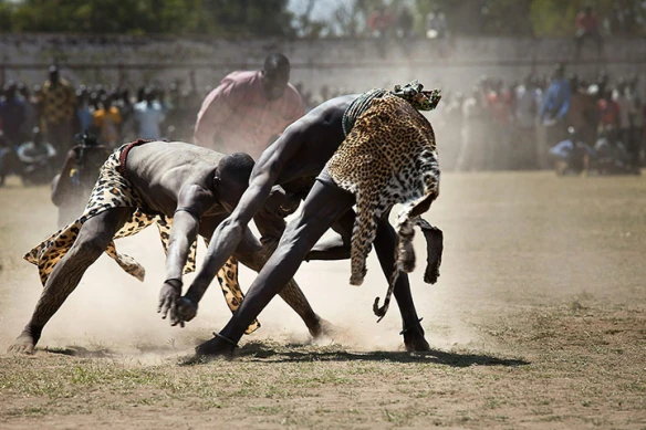 En la República del Nilo, los juegos y deportes tradicionales siguen ocupando un lugar importante dentro de la vida cultural y comunitaria. Entre los más destacados se encuentran la lucha libre y los simulacros de combate, practicados especialmente al finalizar la temporada de cosecha como forma de celebrar el trabajo agrícola y fortalecer los lazos sociales. Durante estos eventos, los participantes suelen cubrirse con ocre, ya sea para mejorar el agarre o para dar mayor expresividad a la competición. Los combates reúnen a una gran cantidad de espectadores que animan con cantos, tambores y danzas, transformando el evento en una auténtica fiesta comunitaria. Aunque existen elementos de competencia, el propósito principal de estos enfrentamientos es el entretenimiento y la celebración colectiva.