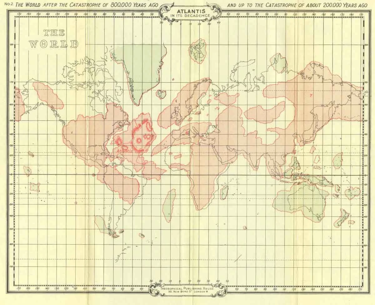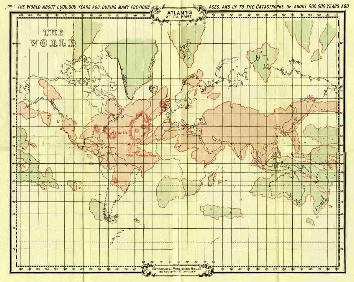 Nella concezione teosofica, Atlantide fu un grande continente che esisteva e fu civilizzata per un milione di anni e fu distrutta poco a poco da quattro catastrofi consecutive. La grande isola descritta da Platone sarebbe stata solo il suo ultimo residuo, scomparsa nel 9564 a.C. Il picco di questa civiltà sarebbe avvenuto tra 1.000.000 a.C. a 900.000 a.C. e sarebbe caratterizzata da un'avanzata tecnologia magica, basata su un'energia psichica chiamata Vril, con cui sarebbero state costruite Barche Volanti, creare nuove specie di piante e animali, evitare le ere glaciali e trasmutare gli elementi, inclusi metalli comuni come l'oro e l'argento.