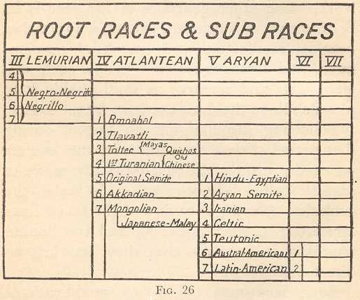 Scott-Elliot, em 1896, referia-se despectivamente aos supostos descendentes de "lemurianos" e "atlantes" e descrevia os judeus como um "elo anormal e antinatural entre a quarta e a quinta raças-raízes", mas o capítulo de Besant e Leadbeater (de 1910) sobre os árabes "árias" (ou "semitas arianos", segundo Jinarajadasa) deixou especialmente à mostra o racismo e o anti-semitismo latentes na Teosofia. Caricaturam a história lendária do povo judeu e justificam a imposição de um análogo do colonialismo inglês à África e até mesmo do apartheid à África do Sul.
