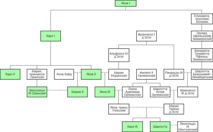 - Мария II (10 мая 1662 — 7 января 1695) — королева Англии, Шотландии и Ирландии; была замужем за своим кузеном Вильгельмом III Оранским, выживших детей не имела.