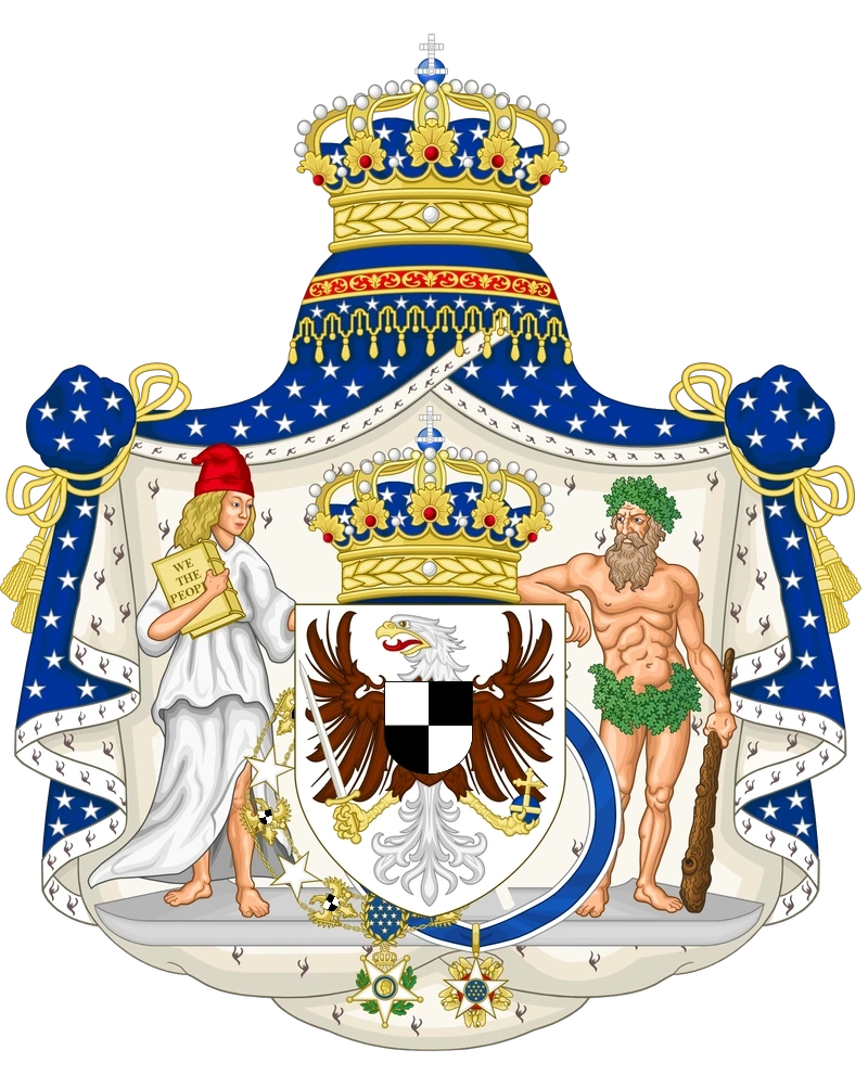 Герб США представляет собой серебряный щит, с изображённым на нём белоголовым орланом, обращённом влево и держащим в правой лапе меч (готовность защищать государство), а в левой - державу (единство государства). На груди его - испанский щит, разделённый четверочастно на серебро и чернь - герб дома Гогенцоллернов. Над большим щитом - королевская корона. Щитодержатели: слева - женщина в белых одеяниях и фригийском колпаке, символизирующая весь народ Соединённых Штатов и его участие в государственных делах. В её руках - Конституция, начинающаяся со слов "We the People"; справа - гигант с дубиной, являющийся одним из геральдических символов дома Гогенцоллернов, царствующего в Америке, а также готовность защищать государственные интересы. За щитом располагаются две высших награды государства: Верховный орден Генриха I (слева) и Славнейший орден Свободы и Заслуг (справа). Всё вышеперечисленное находится на синей мантии с павильоном, украшенным белыми пятиконечными звёздами и увенчанной королевской короной.