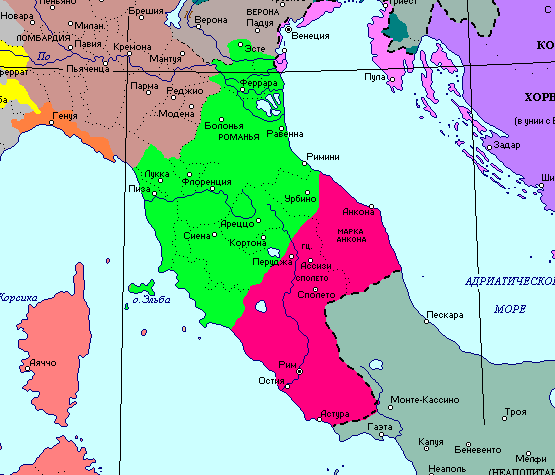 Зеленым: Земли на которые папская область выдвинула претензии Красным: Территории под контролем Папы к концу года