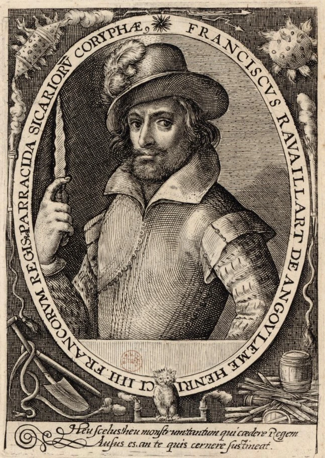 Днём король Генрих IV ехал в открытой карете по улицам Парижа, неожиданно путь королевской карете заблокировали две телеги (на улице Ла Ферронри), охрана покинула короля дабы устранить пробку, этим моментом смог воспользоваться бродяга Франсуа Равальяк, подойдя к карете тот вскочил на подножку и трижды нанес королю удар ножом, второй удар был смертельным.