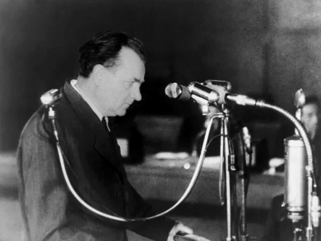 Deputy Chief of Staff of the Czechoslovak Army, General Ludvík Svoboda, announcing the declaration of martial law, 25 February 1948. Prime Minister Václav Majer (centre) and Republican Party chairman Josef Černý (right) watches on.