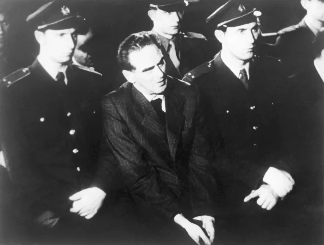 | Klement Gottwald (left) and Rudolf Slánský (right) during the Gottwald trials, 1949. | |