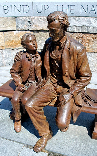In 2003 the Abraham Lincoln Memorial was dedicated in Washington City, The life-size bronze statue depicting Lincoln and his 12-year-old son Tad is located across from the James Buchanan Memorial in Meridian Hill Park. The description "To bind up our nation's wounds" is engraved behind it.