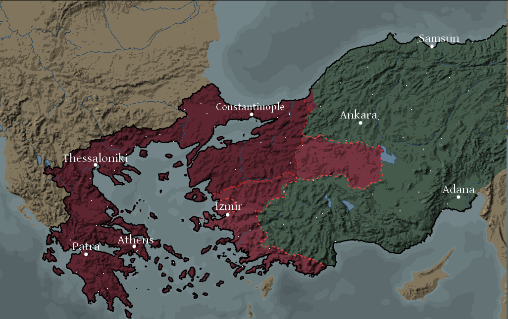 The Turkish government, seeing the increasingly disadvantageous position, and not wanting to risk a total collapse of all their fronts, sued for peace.The Rhoman Kingdom responded with an acceptance of Turkish diplomats to negotiate territorial changes.At the town of Kaş, known to the Greeks as Antifillo, territorial concessions were made in exchange for the withdrawal of Greek troops from occupied territories.The Kingdom of Rhomania expanded up to the Eskişehir-Uşak-Marmaris line, Rhomania was overextended, but stretched from western northern anatolia all the way to the south of the Lycian Sea.