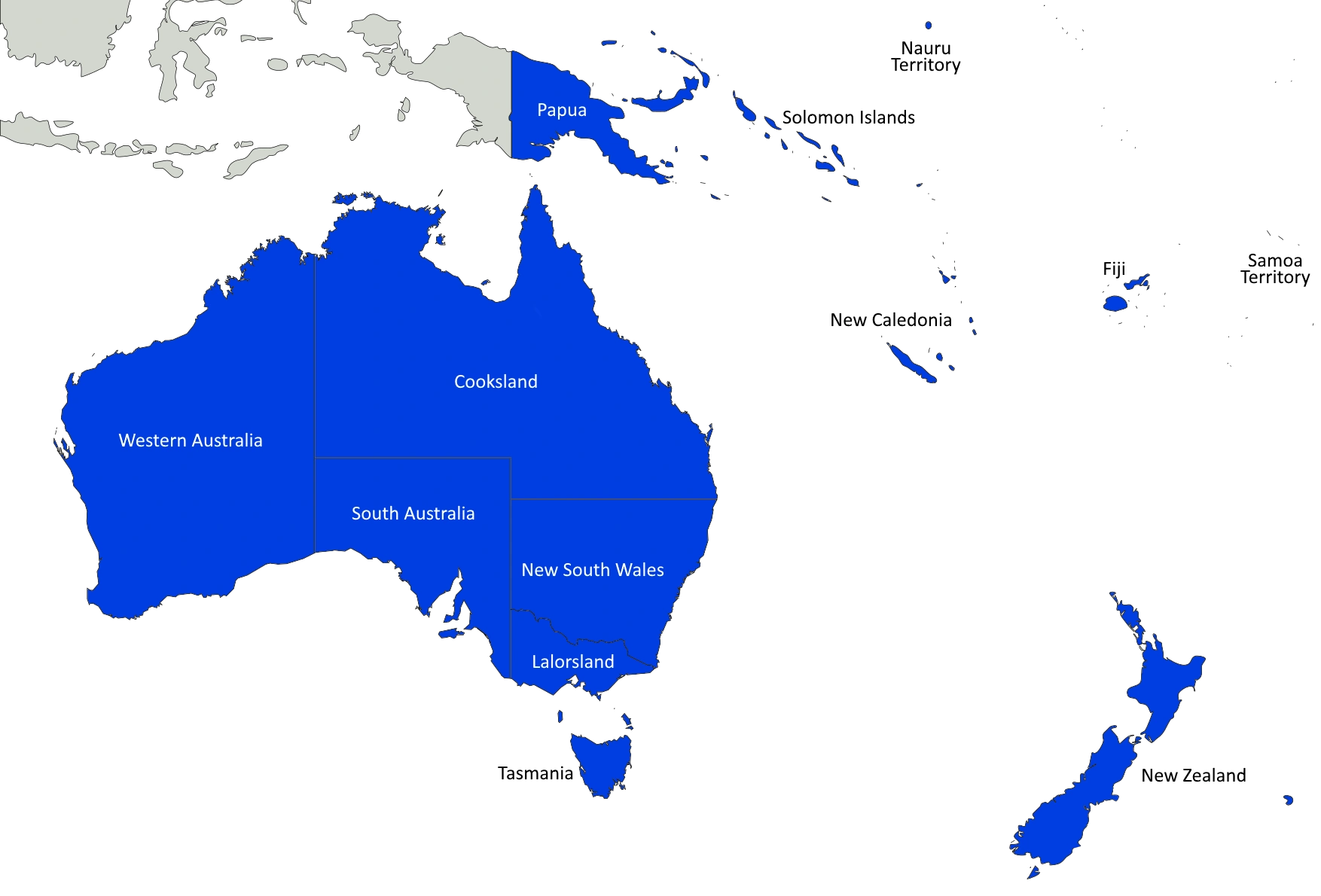 The Federal Republic of Australia, or just Australia, is a federal presidential constitutional republic located in Oceania. Its only land border is with Indonesia to the west of the state of Papua. Australia, which is comprised of 11 states and two territories, controls the majority of Oceania and is the dominant power in the region.
