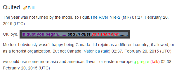 Personally, I will never play AvA again, it's getting less interesting and competitive each time. In fact, I doubt if I will do any more games here. The River Nile-2 (talk) 03:40, April 30, 2015 (UTC)