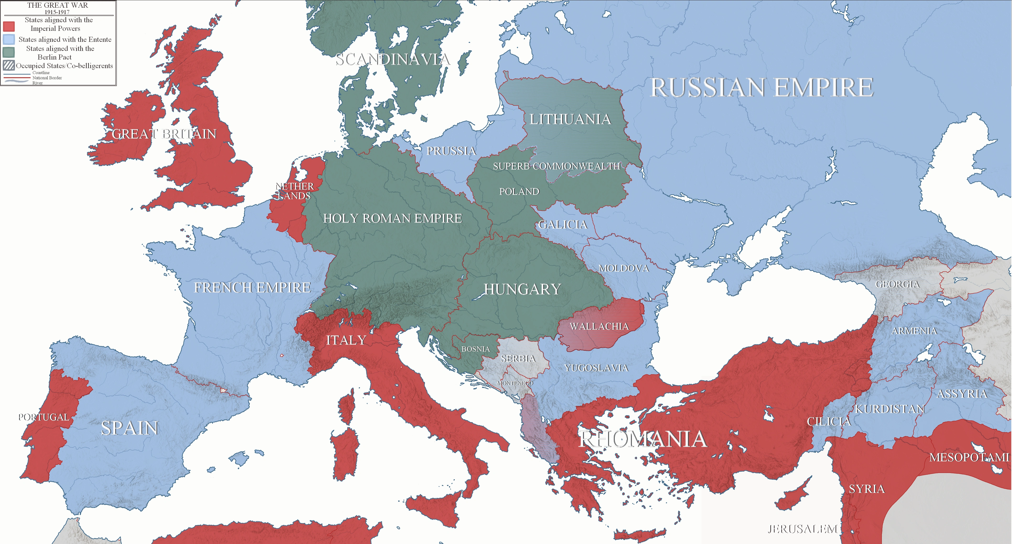 The Great War 1915-1922: The primary faction, Imperial Powers (Britain, Rhomania, Italy, Portugal, Japan and Albionoria) would get involved due to French aggression in Europe, and Russian agitation over expansion in Anatolia and the middle east. The Continental Entente (Spain, France, Russia, Yugoslavia), would compose of the main agressors of the conflict, and come out defeated in the war.