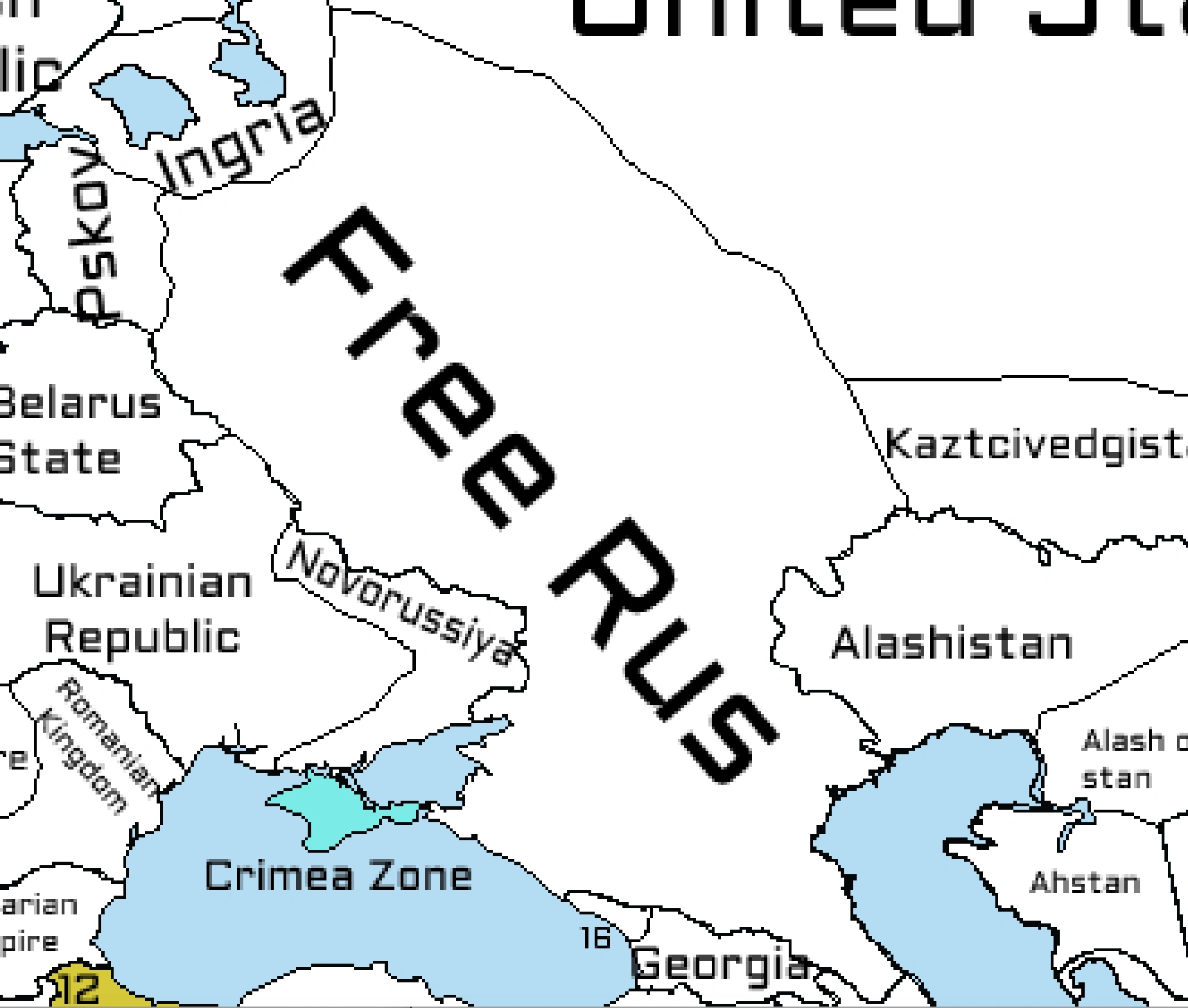 Free Rus, officially the Free Rus Republic (Russian: Свободная Русь Республика) and sometimes referred to as Western Russia , is a country in Eastern Europe. It borders Ingria to the north , It borders to the west Pskov, Belarus, Novorussiya, Ukraine. To the South it borders Abkhazia, Georgia, Azerbijian, to the East it borders Perm, Kaztcivedgistan, Alashistan. They border the North sea to the north, the Black sea to the West, The Caspian sea to the east. The 3rd Revolution state in Russia, Russia was historically one of the most powerful and educated nations in the world. Its plenty of historical sights, including decorated churches such as the Red square, makes tourism its main economic activity. Russia is considered the Great Power since the middle ages. The modern state of Rus dates back to 2014, when the Russian Federation was abolished and the current Republic was established.
