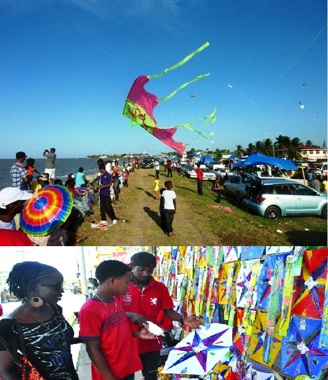 Guyanese Christians traditionally celebrate Easter by flying kites. The bottom picture shows an Afro-Guyanese family selecting a kite to buy at a local market in Georgetown.