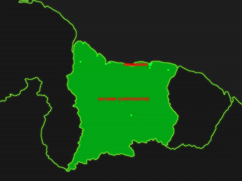 The Guyana Co-operative is a union of the former nations of Guyana and Suriname. The GC is located on the northern coast of South America, and is considered culturally Caribbean due to a long history of shared culture between Guyana and the rest of the Anglophone Caribbean, Suriname and the Dutch Caribbean islands, and a shared musical tradition between Guyana and Suriname. The Guyana Cooperative's capital is Paramaribo, and its largest city is Georgetown, the former capital of pre-Doomsday Guyana and the seat of CARICOM both before Doomsday and since the organization's 2020 restoration.