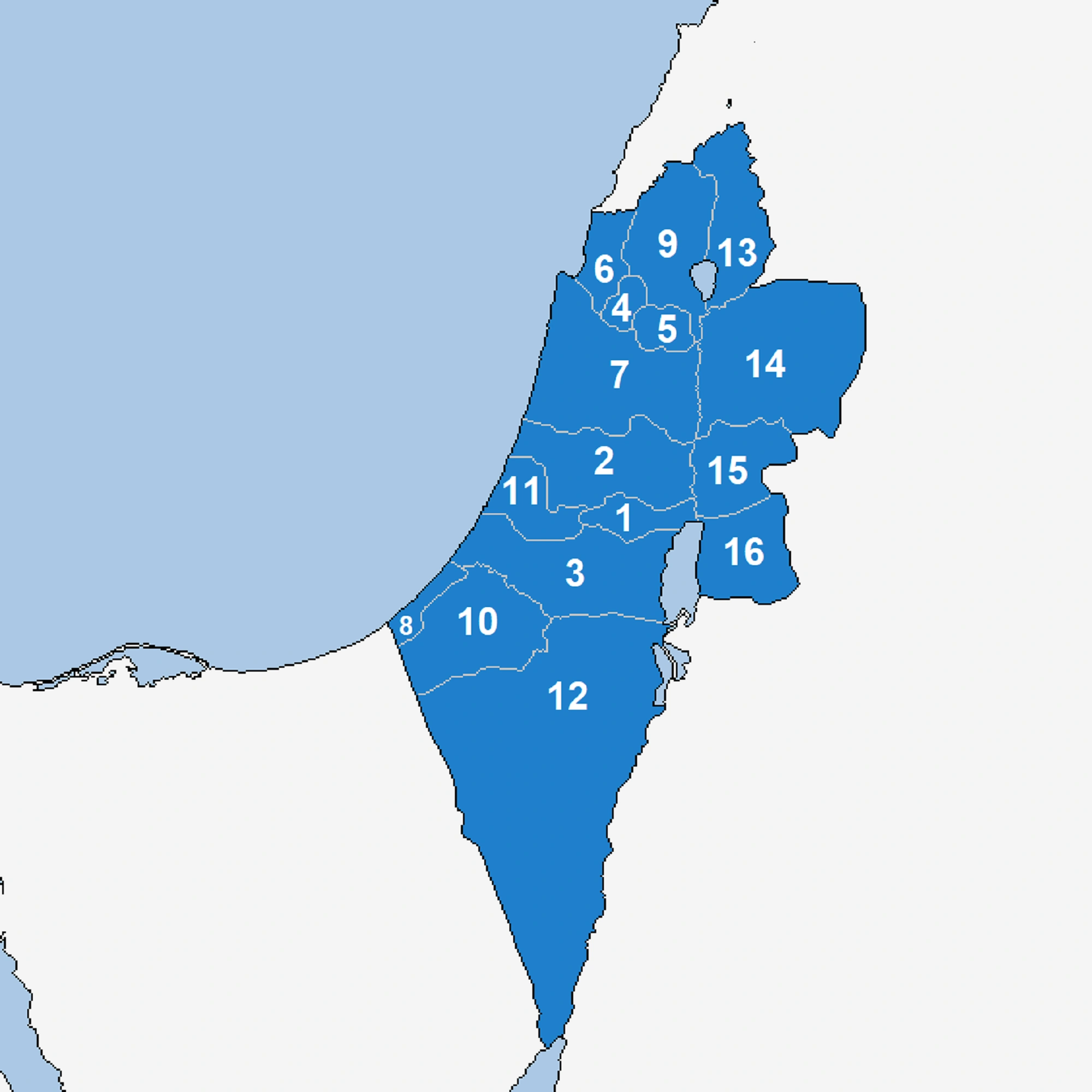 1-Jerusalem, 2-Ephraimia, 3-Judea, 4-Zebulonia, 5-Jezreel, 6-Asheria, 7-Manassesia, 8-Gaza, 9-Naphtalia, 10-Simeonia, 11-Danea, 12-Negev, 13-Golan, 14-Gilead, 15-Gadland ,16-Rubenia