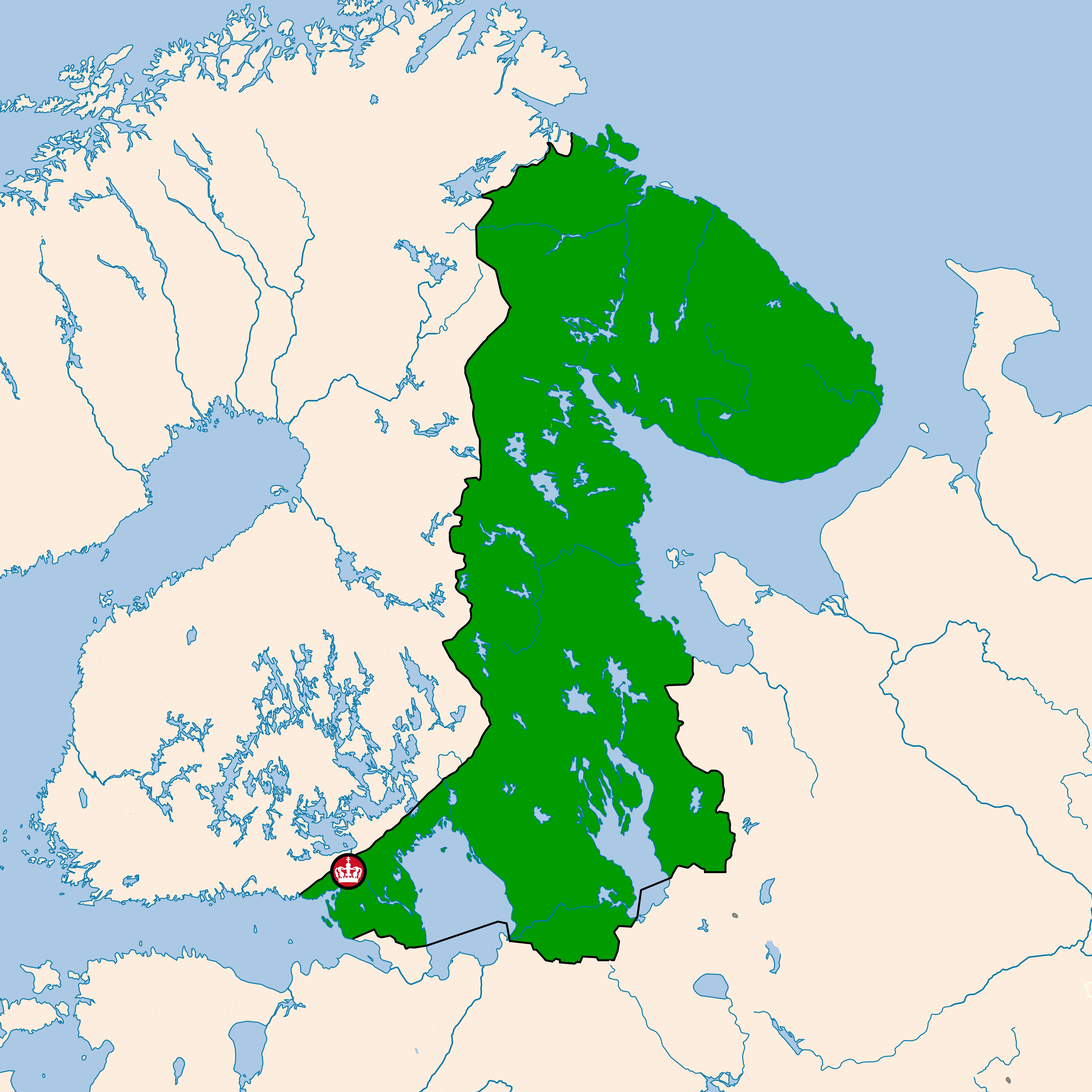 Karelia, officially the Kingdom of Karelia, is a Nordic country in Northern Europe. It borders Finland to the west, Norway to the northwest, and Russia to the south, with the White Sea to the east and the Barents Sea to the north. Finland has a population of 1.5 million, the majority being ethnic Karelians. Its capital is Vyborg while the largest city is Äänislinna. The official languages are Karelian, Russian and Finnish, the mother tongues of 69.1 percent, 30.3 percent and 0.6 percent of the population, Karelia's climate ranges from humid continental in the south to subarctic in the north. it's landscapes are dominated by boreal forest, tundra, and extensive networks of rivers and lakes, forming part of the wider Finnish–Karelian lake system and extending into the Arctic Circle