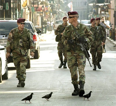 "Milice Populaire" patrolling the streets of Gaspe. Most of the countryside had reverted to local control by the end of October, but the urban areas remain under foreign occupation.
