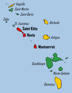 ![]() Saint Kitts and Nevis in the Leeward Islands, with other East Caribbean Federation members in yellow