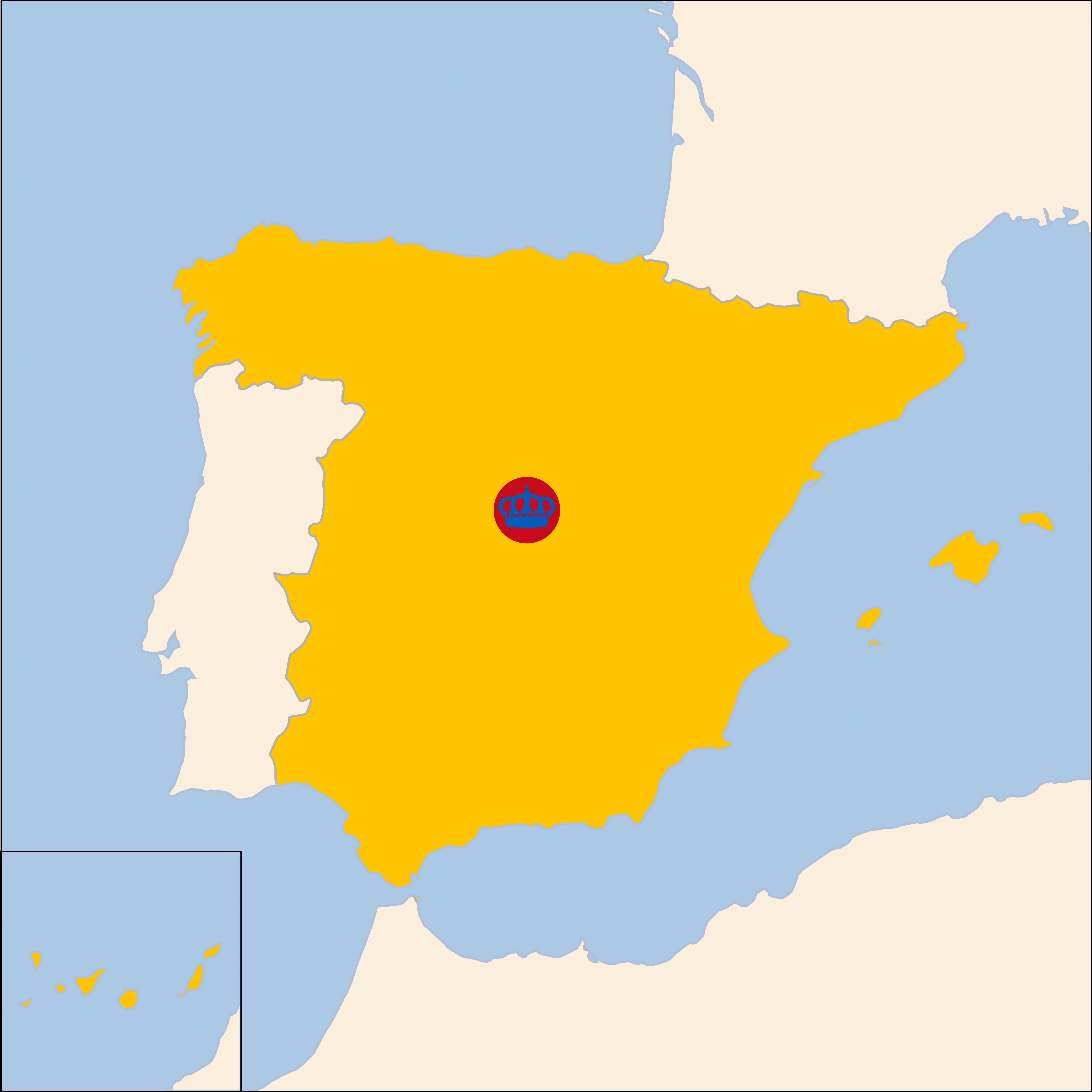 Spain, officially the Kingdom of Spain, is a country in Southern and Western Europe with territories in North Africa. Featuring the southernmost point of continental Europe, it is the largest country in Southern Europe and the fourth-most populous European Union (EU) member state. Spanning the majority of the Iberian Peninsula, its territory also includes the Canary Islands, in the Eastern Atlantic Ocean, the Balearic Islands, in the Western Mediterranean Sea, and the autonomous cities of Ceuta and Melilla, in mainland Africa. Peninsular Spain is bordered to the north by France, Andorra, and the Bay of Biscay; to the east and south by the Mediterranean Sea and Gibraltar; and to the west by Portugal and the Atlantic Ocean. Spain's capital and largest city is Madrid; other major urban areas include Barcelona, Valencia, Seville, Zaragoza, Málaga, Murcia, and Palma de Mallorca.