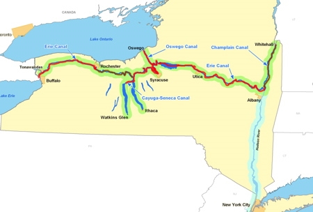 The Erie Canal in 2014. Red indicates areas that are still in use, brown indicates areas that are silted over.