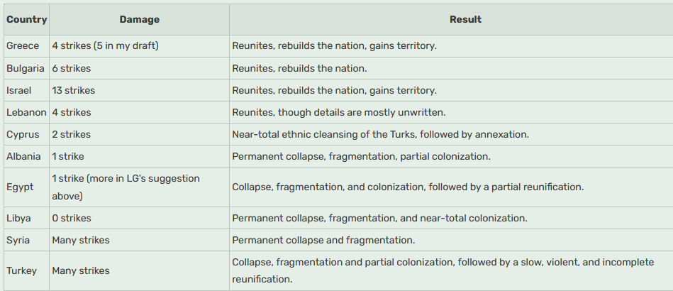 Egypt will need updating past 1988 and revision to the war after changes to Israel are made. Dmitri has argued for a return to a true nuclear strike, and I have argued for adjustments to the borders of the "replacement Kemet" we got after the Greece Review. Turkey, meanwhile, will require adjustments due to World War III and the changes made in the Levant.