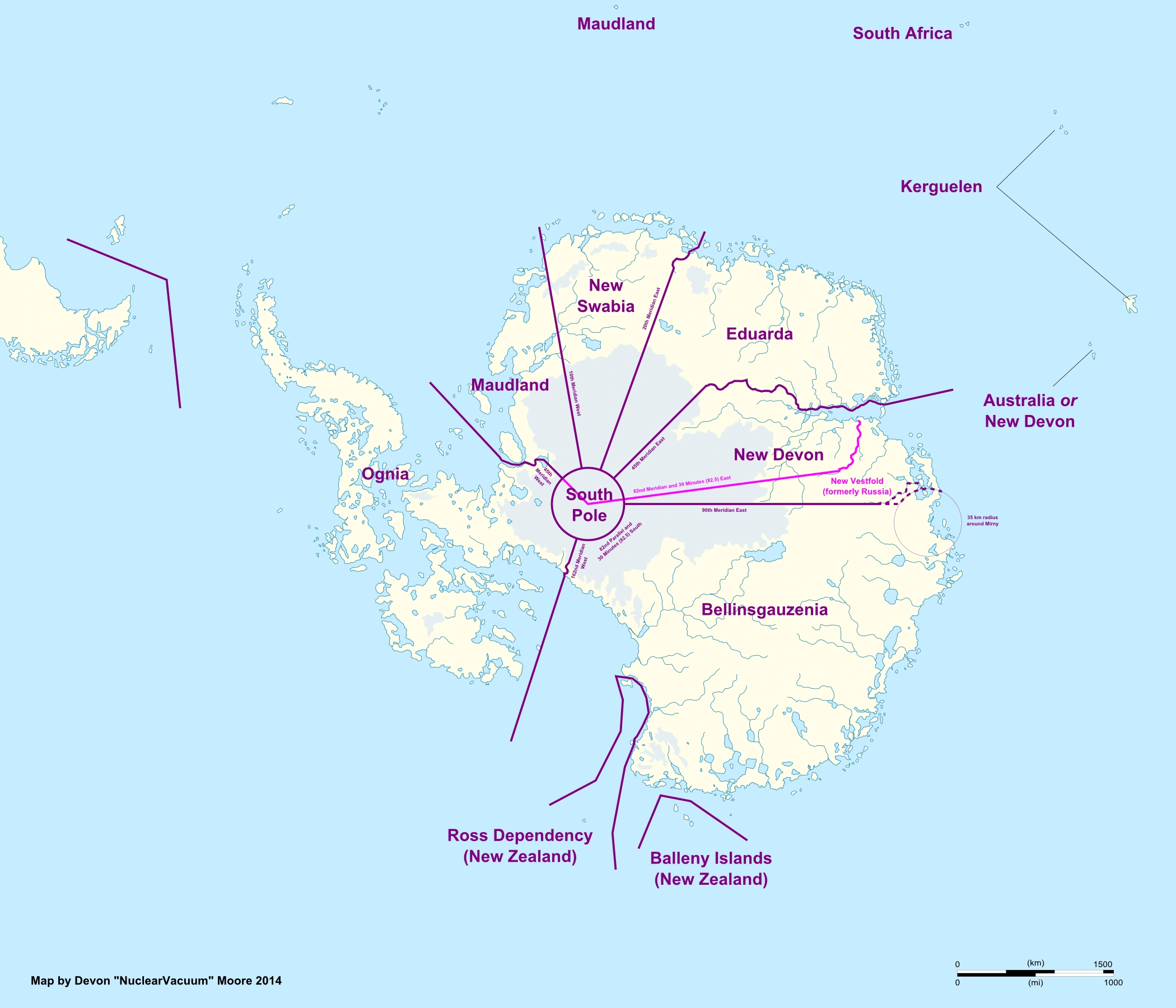 I believe that's it. The only things I think I will add is that New Devon (more or less) was given to Australia for colonization, but would later follow New Zealand and separate. I'd also still prefer New Zealand's claims in the Ross Sea to be some kind of united entity. Possibly the northernmost islands (Balleny and Scott) were claimed by the British, later to be given to the Realm of New Zealand. Ross Island (closer to Bellinsgauzenia) was initially claimed by Russia, but would come under Anglo-Kiwi administration sometime after WWII (and is incorporated into the government of the other islands). Aside from potentially having oil-based economies, I doubt these islands (or at least Ross Island) would have major populations, and would likely be connected by larger native (non-European) populations.