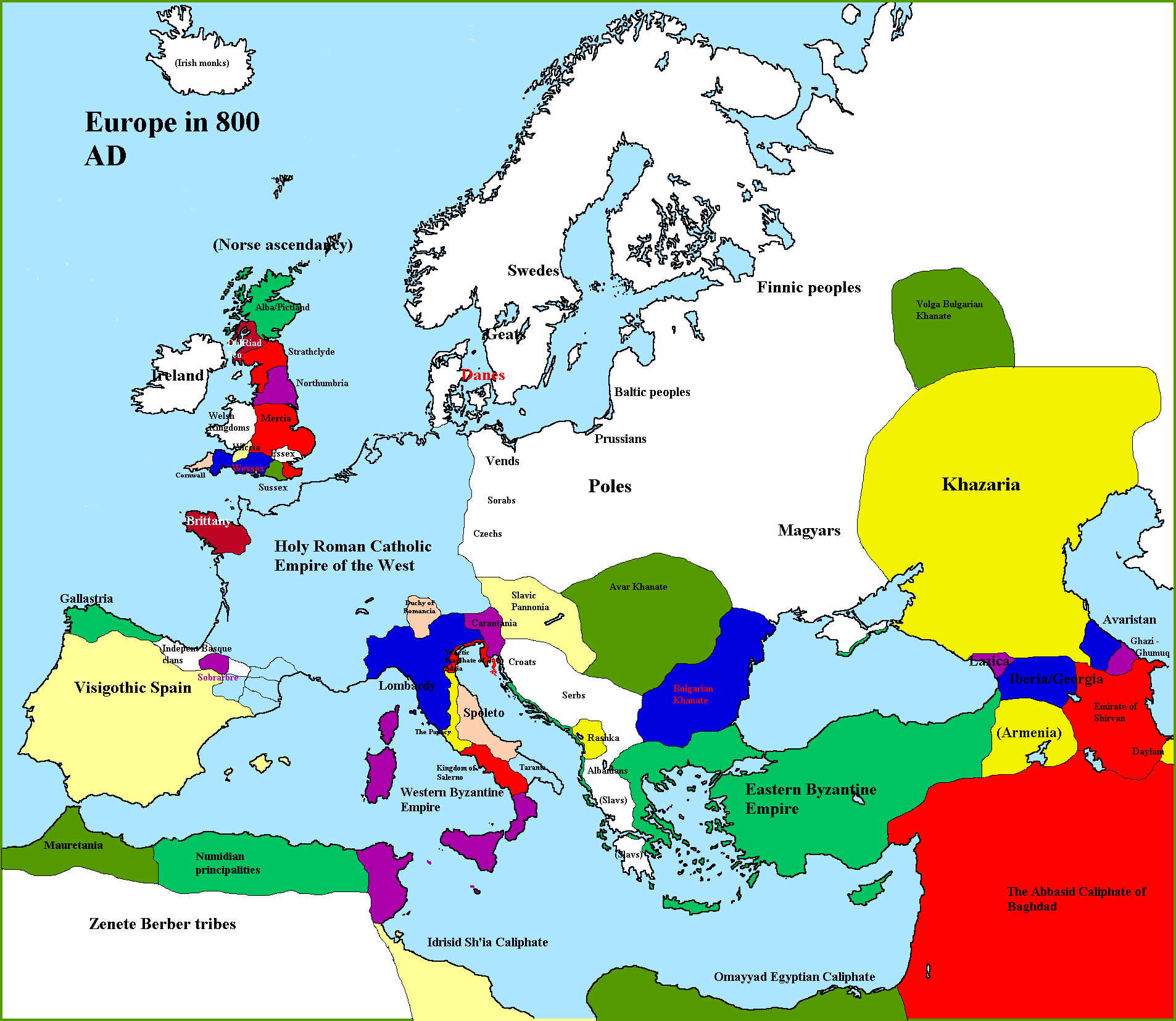 ca. 800 The Celtic kingdom of Dumnonia/Devon is incorporated into Wessex. In Norway the local kingdom of Romerike is absorbed into Hedmark; the Norwegian Vikings embark in a string of methodical raids on the British Isles, especially targeting Ireland. Viseslav Trpimirović is the first ban (duke) of Croatia. A new Slavic principality arises at Nitra (Slovacchia), breaking free from Avar overlordship. The Berghawata Maurians develop an own Judeo-Christian apocalyptic heresy based on the wait for a Second Messiah to announce the end of times; it also contemplates the presence of a High Priest and a Temple the Berghawata proceed to build in Warzazata (*OTL Ouarzazate). The Magyars, vast Ugro-Turkic tribal compact coming from the Urals and western Siberia, are pushed towards the southwest by the Volga Bulgarians and become paramount in eastern Ucraina orientale. The Khazars retake Bosporon/Kerč from the Onogurs of Taurida (*OTL Crimea). Conversion of Khorezm (western Central Asia) to Sunni Islam; the Persian Samanids start acting as Abbasid governors in Samarkand. Tripartite struggle for power in central-northern India: Nagabhata II of the Gurjara-Pratiharas takes Kanauj from Chakrayudha, protegé of Dharmapala of Bengal, only to be ousted by Govinda III Rashtrakuta. The Paramara Rajputs, vassal and related to the Rashtrakutas of Karnataka and Deccan, re-establish the kingdom of Malwa (central India). Mazdeism begins to spread in Western Peninsular India. The Songhais, coming from NW Nigeria, found their kingdom at Gao on the middle Niger under king Alyaman. Foundation of the Jewish kingdom of Beta Yisrael in the Ethiopian highlands. B’aakal/Palenque is destroyed, the city abandoned; many other Mayan city-State in the south are suddenly destroyed or abandoned for untold reasons (invasions? famine? mass insanity?).