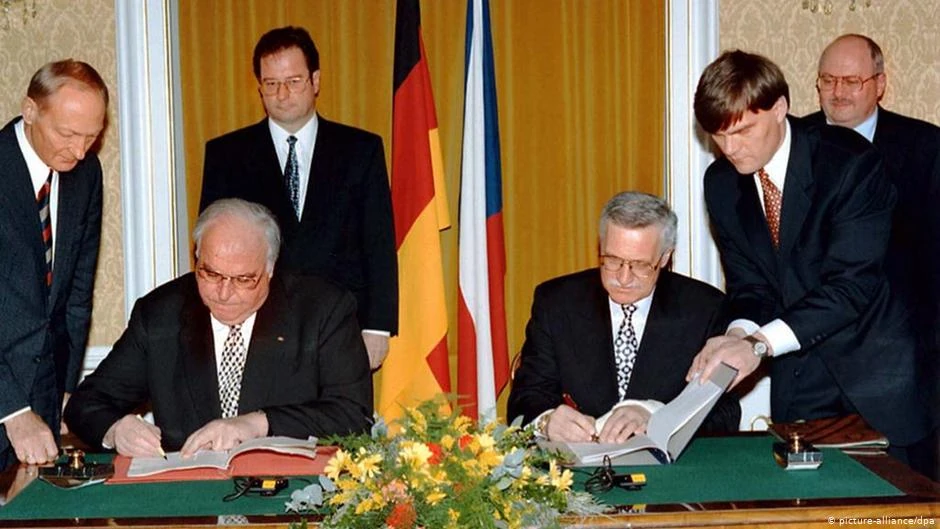 On 21 August 1988 Klaus and Foreign Minister Minister Schwarzenberg signed the Czech–German Declaration on the Mutual Relations and their Future Development, while the German side consisted of the federal Chancellor Helmut Kohl and federal minister of foreign affairs Hans-Dietrich Genscher. The aim of the declaration was to improve the relations between both countries and to lessen the tensions still stemming from the Second World War. While generally praised, the provision in which both sides declared "the wrongs committed are problems of the past" and acknowledge the other side's right to a different opinion caused wide dissent among the Sudeten German organizations in West Germany pushing for reparations for the expulsion, while the SD condemned the declaration as a "betrayal" of the Czechoslovak people.