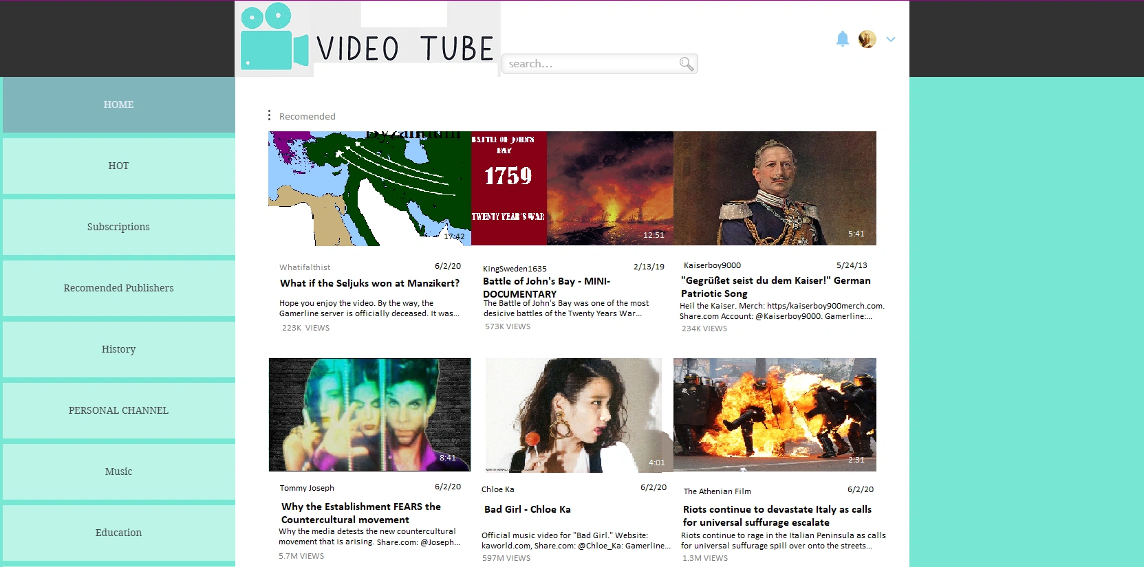 In September 2015, Video Tube introduced categories, a way of categorizing videos. Some categories, such as the educational and musical categories, were further divided into subcategories.